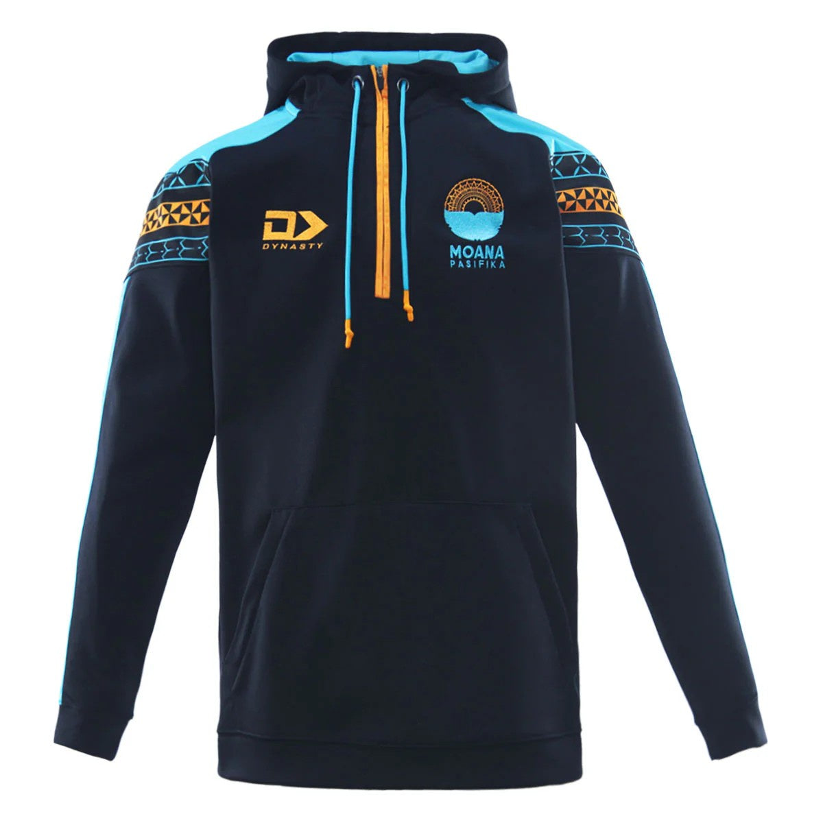 Designed for training and travel, this black 1/4 zip hoodie features teal panel detailing and shoulder taping for a strong athletic look. Includes a kangaroo pocket, adjustable hood with toggles, and screenprinted wordmark for a bold team finish.